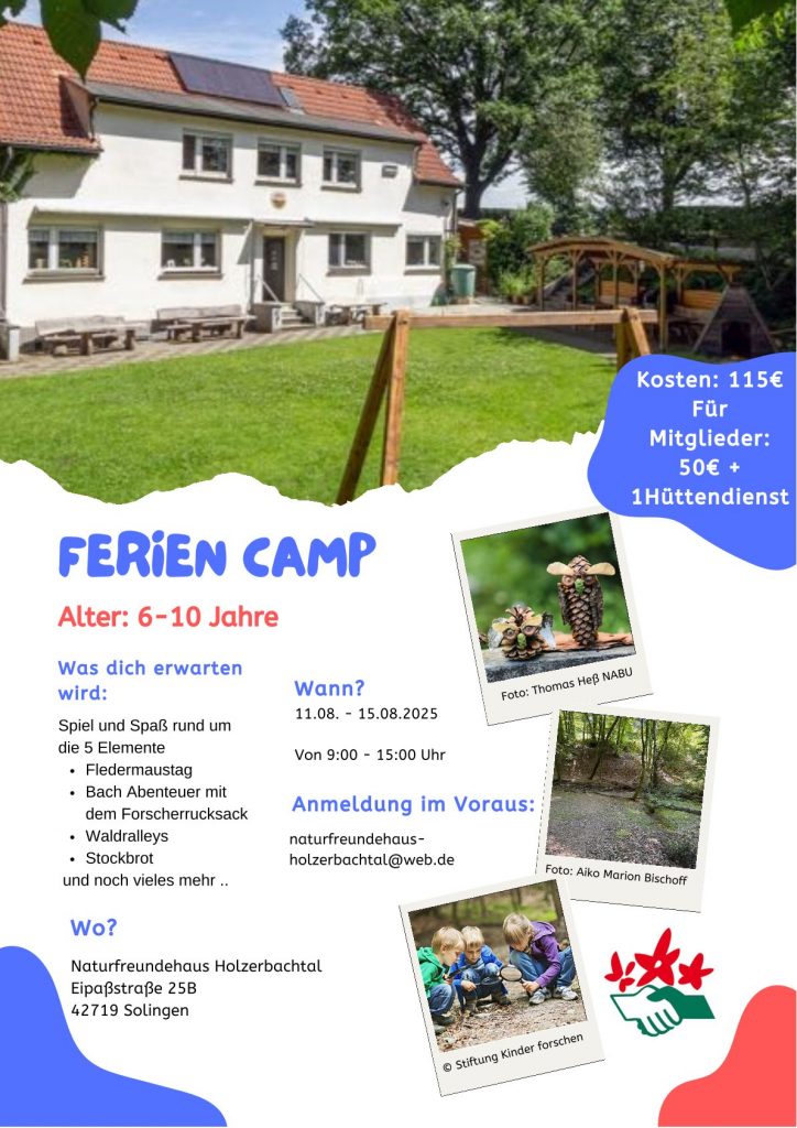 In diesem Jahr bieten die NaturFreunde Solingen-Wald/Ohligs e.V. in der Woche vom 11.8. – 15.8.25, also zwischen den kulinarischen Tagen, täglich in der Zeit von 9.00 – 15.00Uhr ein Feriencamp für Kinder von 6 bis 10 Jahren an. Hierbei wird es ein großes Angebot an Spielen und Entdeckungsreisen in der Natur des schönen Holzerbachtals geben. Es gibt die Gelegenheit unsere neuen Erlebnisrucksäcke auszuprobieren. Entlang unseres Naturlehrpfads werden Experimente und spannende Spiele angeboten. Für Speisen und Getränke ist gesorgt. Es gibt noch wenige freie Plätze. Daher schnell anmelden!